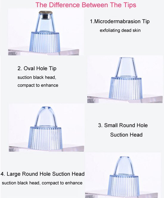 Small size circular form probe’s suction is weaker, aim the round hole at the location of the blackhead, acne to remove them. If the skin get hurt or swollen, not recomment to use it. And if the backhead in the pore deeply, use the big size probe is better. This small size probe suitable for sensetive skin.
